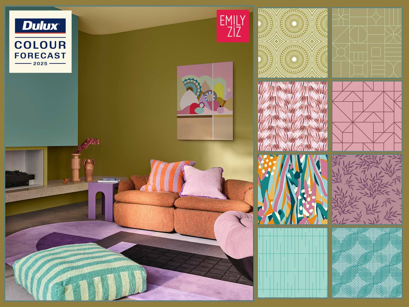 These moodboards featuring our print patterns are inspiredby the recent Dulux 2025 Colour Forecast - "Emerge" Palette